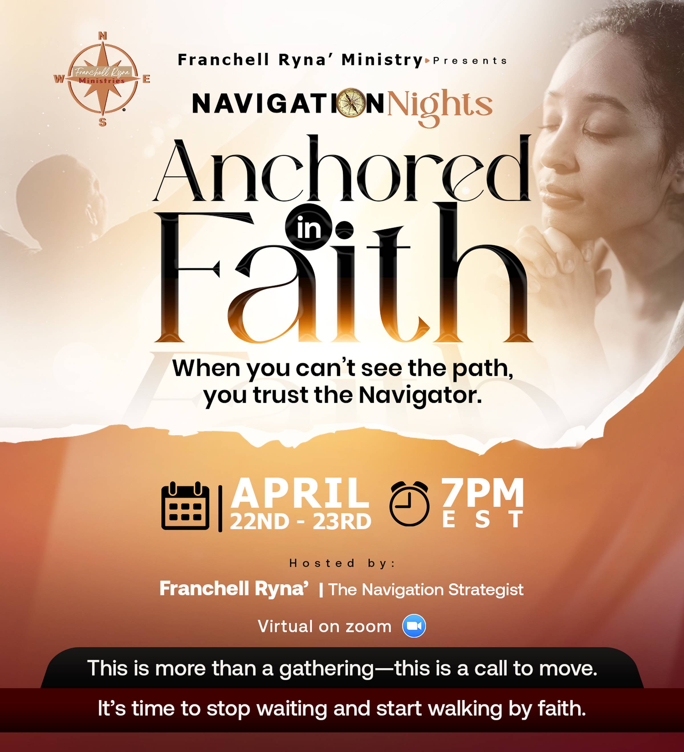 Navigation Nights: Anchored in Faith is a sacred, prophetic space for women who are ready to trust God beyond what they can see. Over two powerful nights, we will journey through what it means to trust God fully and then move forward boldly—even without clarity.